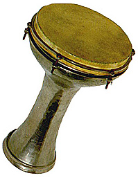 goblature or chalice-shaped, metal drum. It is then stretched with goatskin on